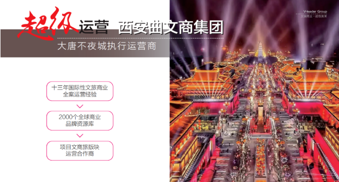 西安曲江文商商業運營管理有限公司(以下簡稱曲江文商商管)是一家專注于商業地產運營管理的公司,有著十三年豐富的全國文旅商業的運營經驗,隸屬于西安曲江文化產業投資(集團)有限公司,業務覆蓋陜甘、河北、重慶、湖北和江浙地區。公司以“文創”、“文演”、“文游”、“文娛”、“文食”、“文旅”和“文玩”七大核心開創城市文旅生活,在文商綜合體領域具備獨特的競爭優勢。從西安標志性文化旅游項目大唐不夜城大的執行運營到芙蓉新天地文旅街的西安文旅城市新名片,曲江文商正以其超強的運營管理能力,助力一個又一個項目成功。